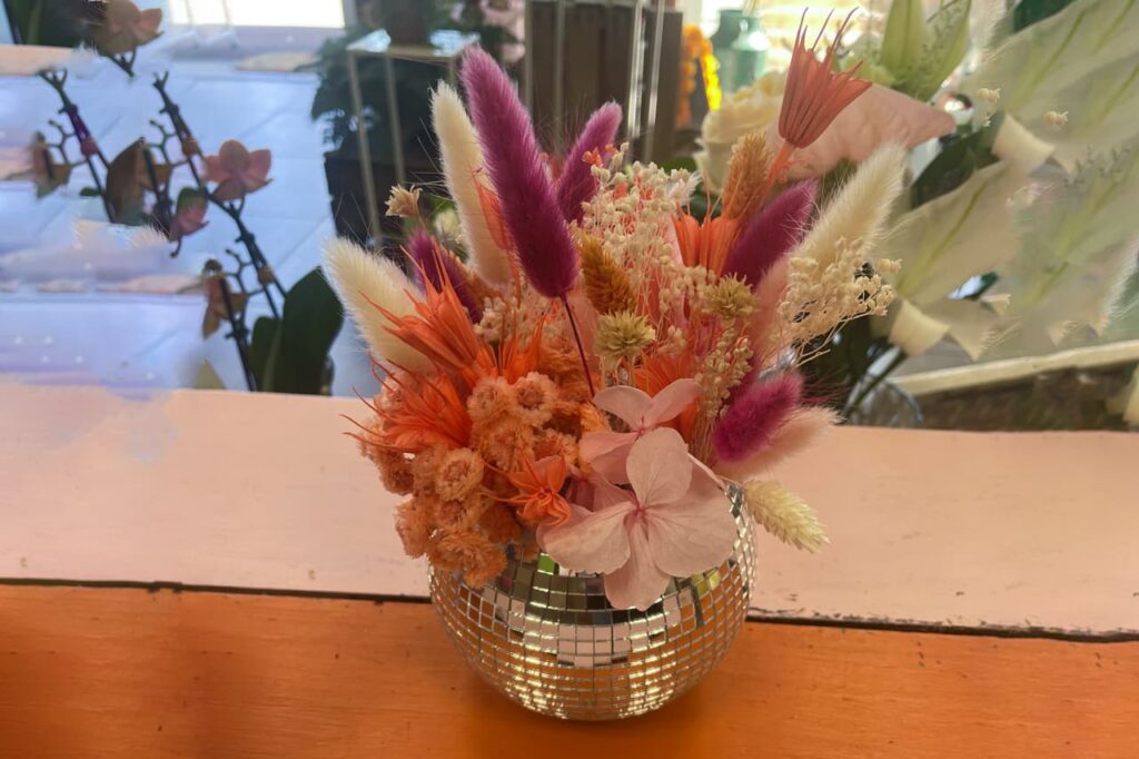 apprendrez à concevoir une composition florale sur une boule à facettes.
